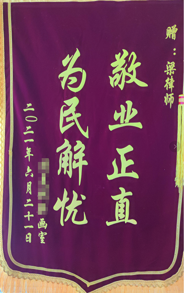 | 北京委托人赠送梁开贵律师锦旗:敬业正直,为民解忧 |