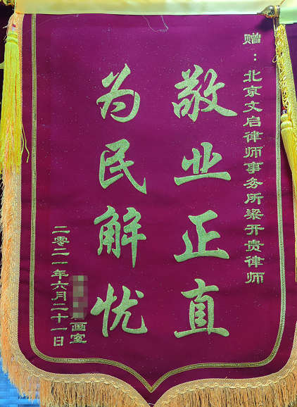 | 北京海淀委托人画室赠送梁开贵律师锦旗:敬业正直为民解忧 |