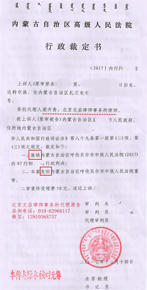 | 内蒙古呼伦贝尔胜诉:内蒙古自治区高级人民法院撤销呼伦贝尔市中级法院判决,发回重审 |