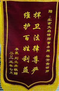 | 北京文启律师获赠锦旗:捍卫法律尊严,维护百姓利益,2023.7.19 |